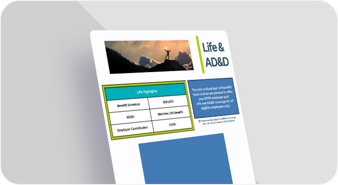 Life & AD&D Life Highlights You are a valued part of the MPS team and we are pleased to offer you 100% employer paid Benefit Schedule $20,000 Life and AD&D coverage for all eligible employees only. AD&D Matches Life Benefit Please see next page for additional coverage Employer Contribution 100% that can include spouse and dependents