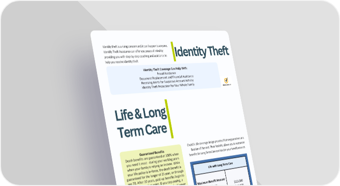 Identity Theft Identity theft is a rising concern and it can happen to anyone. Identify Theft Assistance can offer you peace of mind by providing you with step-by-step coaching and assistance to help you resolve identity theft Identity Theft Coverage Can Help With: Fraud Assistance Document Replacement and Financial Assistance Receiving Alerts for Suspicious Account Activity Identity Theft Protection for Your Whole Family Life & Long Term Care Chubb’s Life coverage design provides lifetime guarantees at a fraction of the cost. Their flexibility allows you to customize benefits for Long Term Care and double your benefit amount. Guaranteed Benefits Death benefits are guaranteed at 100% when you need it most - during your working years when your family is relying on income. While your life policy is in-force, the death benefit is guaranteed for the longer of 25 year, or through age 70. After 10 years, paid-up benefits begin to accrue. After that point, if you stop paying, a reduced paid up amount is issued and will never lapse. So if you retire and stop paying premiums, you will still have a guaranteed death benefit. Long Term Care This benefit pays you death benefits in advance for home health care, assisted living, adult day care and nursing home care. By adding the LTC extension, LTC benefits can last for more than 4 years. With the Death Benefit Restoration, a percentage of the death benefit will be restored; assuring the beneficiary will receive a death benefit even if the original benefit was fully accelerated for LTC. Life with Long-Term Care Maximum Benefit Amount: Employee Spouse Child $225,000 $112,500 $25,000 Guarantee Issue: Employee Spouse Child $150,000 $75,000 $25,000