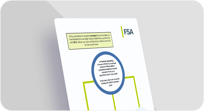 For pricing & more information, please refer to benefit packet Use account to pay for general out of pocket health costs You can rollover up to $680, but any additional funds remaining will be lost. Contribution limit of $3,400 FSA Only available to anyone except those enrolled on the HealthChoice High Deductible Plan, as the IRS will NOT allow you to contribute to a HSA and FSA at the same time. A Flexible Spending Account (FSA) is a savings account filled with a predetermined pre-taxed amount from your paycheck each pay cycle. Expenses must be incurred during the 2026 calendar year.