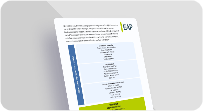 EAP We recognize how important our employees and family members’ work/life balance is as you go through life’s many challenges. Through our partnership with Symetra, an Employee Assistance Program is available to you and your household family members at no cost. This program offers you someone to talk to and resources to consult whenever and wherever you need them. Don’t be afraid to reach out for help as, required by law, issues are kept completely confidential and private from all employers. What can my EAP help with? Confidential Counseling Stress, anxiety, and depression Financial problems Difficulties with children Job pressures Grief and loss Substance abuse Legal Support Divorce and family law Debt and bankruptcy Landlord / tenant issues Real estate transactions Civil and criminal actions Contracts Financial Information and Resources Getting out of debt Credit card or loan problems Tax questions Retirement planning Estate planning Saving for college Symetra EAP Phone: 888-327-9573 Online: Guidanceresources.com Mobile App: GuidanceNow Web ID: SYMETRA For further questions and details, see full benefit summary. You can also go to www.symetra.com.com or call 1 (877) 823-5807.