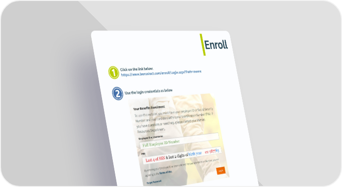 Enroll Click on the link below: https://www.benselect.com/enroll/Login.aspx?Path=moore For technical assistance you may call Total Benefit Solutions at 888-783- 9653. (Hours M-TH 8:30 AM to 5:00 PM and Fridays until 4:00 PM CST) This guide can be found in the Library in the upper right hand corner of the Benefit Portal once you have logged in Use the login credentials as below Please contact INS with any additional questions or concerns Full Employee ID Number